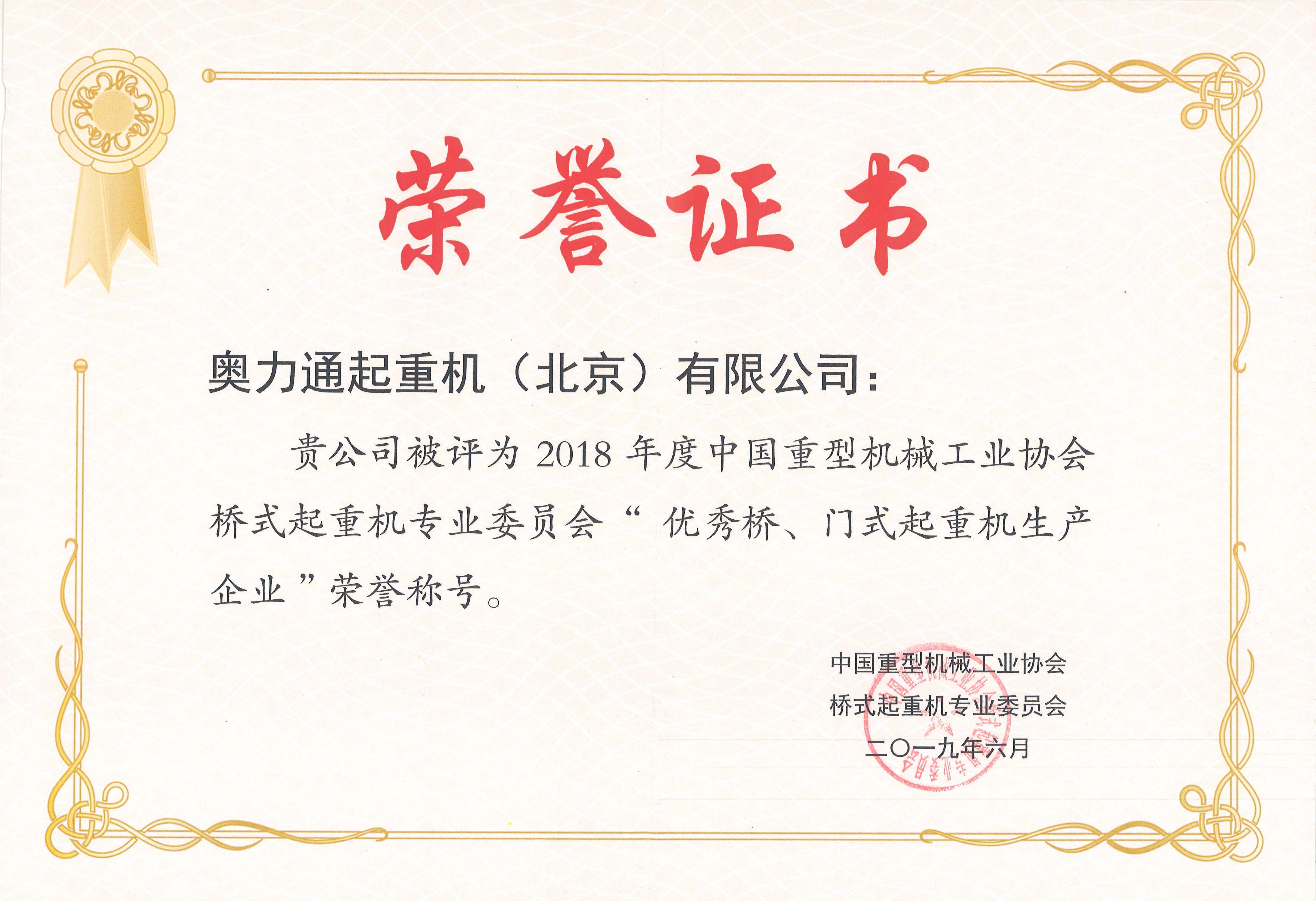 (球速体育荣获2018年度“优秀桥、门式起重机生产企业”)