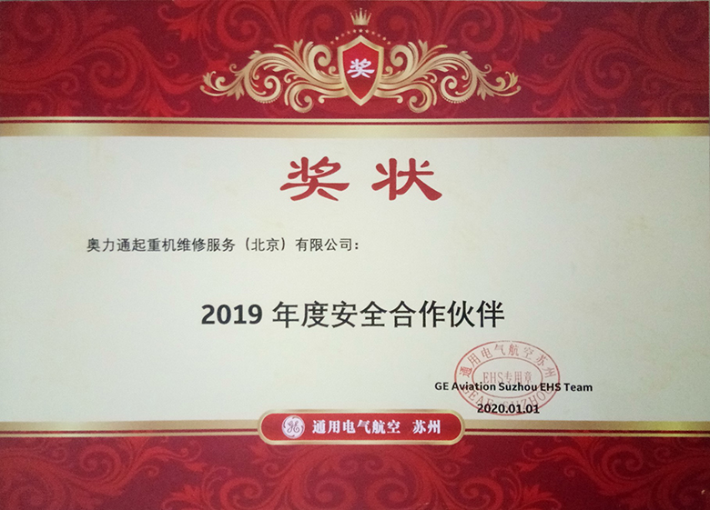 随着2020年的到来,美好的一年再度启程;新年伊始,球速体育起重机维保服务团队收到了合作伙伴通用电气(GE)航空集团的新年礼物---2019年度安全合作伙伴奖,以此表彰和感谢球速体育维保服务团队长期以来为通用电气(GE)航空集团提供的安全、质量、高效的起重机维保服务。