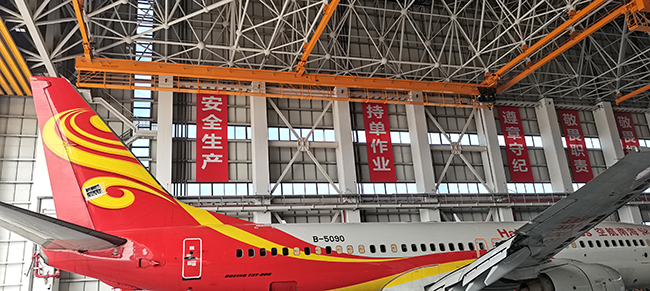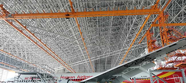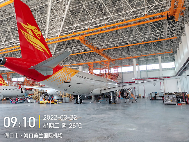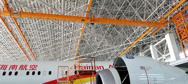 海口空港飞机维修工程有限公司于2020年8月向球速体育采购海口民航飞机维修机库用多支点超大跨度悬挂起重机8台,应用于海口美兰机场新基地机库的建设,于2022年3月正式交付投入试运营,在中国南大门的自贸港中再添亮丽的一抹金色,球速体育成为海航飞机的最美守护神。