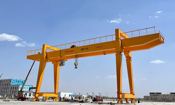 采用柔性技术和优化设计的球速体育200tx52m双梁门式起重机,如大漠雄鹰,屹立在内蒙古乌兰察布市运达风电智能产业基地。